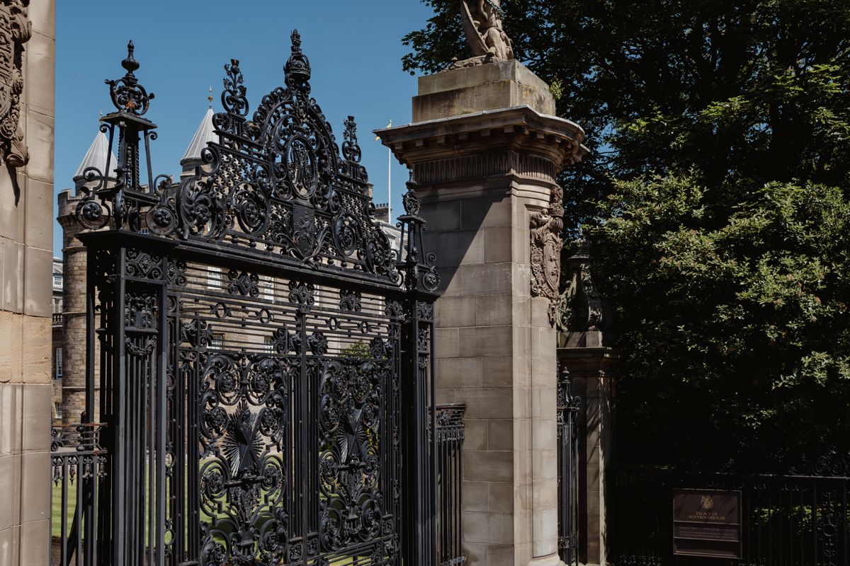 A small garden building between the railings of the Palace of Holyroodhouse, surviving from the 16th century.