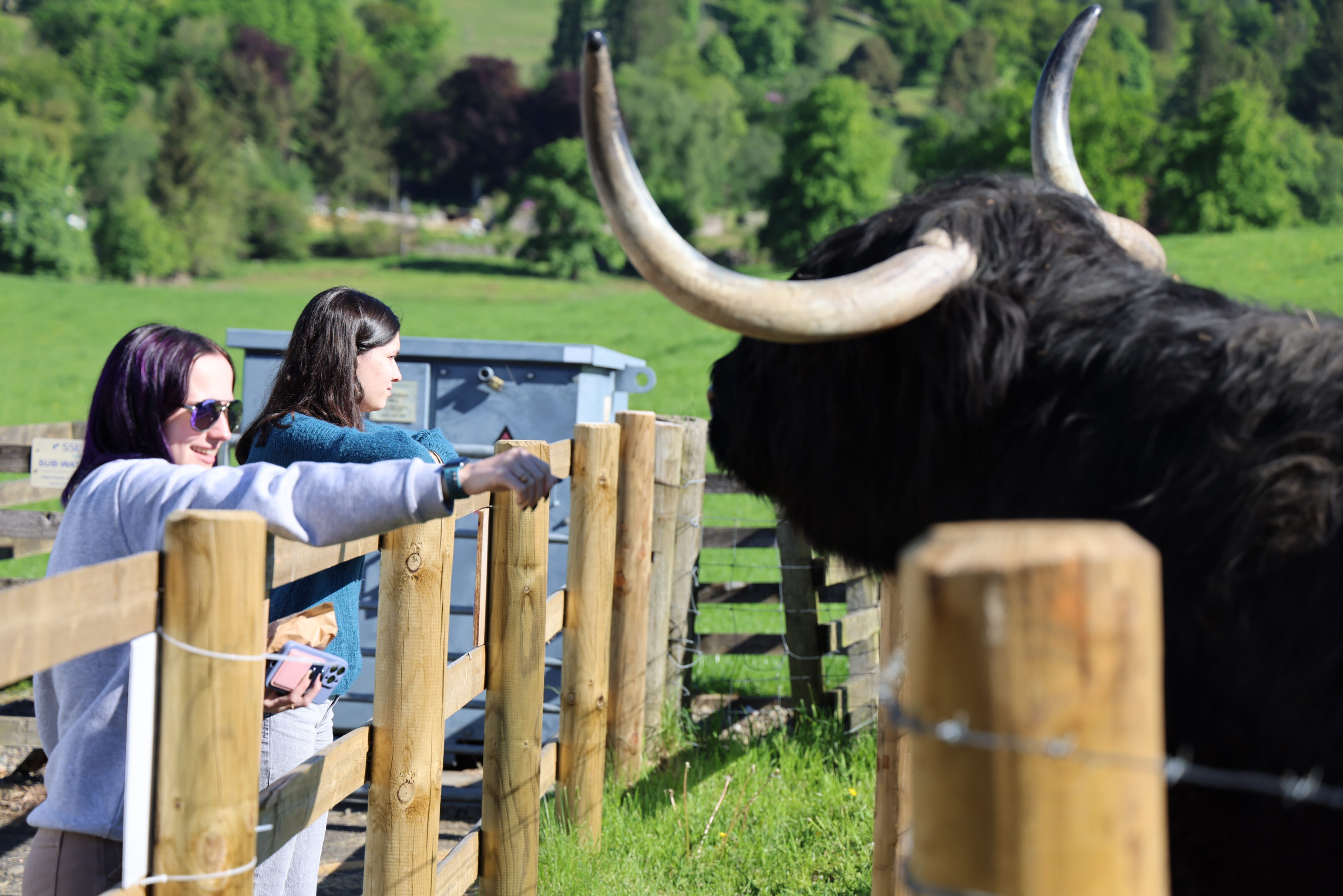 Heading into the highlands we pass some of Scotland’s most important historical sites including the Kelpies, Stirling Castle and the National Wallace Monument. From there we travel into the Trossachs National Park amid magnificent Scottish scenery and town of Callander before reaching our first stop in the pretty hamlet of Kilmahog. Parking at the Kilmahog Woollen Mill, you can meet the resident Highland Cows – Honey, Hamish Dubh and Holly – and even get the chance to feed them yourself with homemade goodie bags which are available to purchase from inside the Mill.