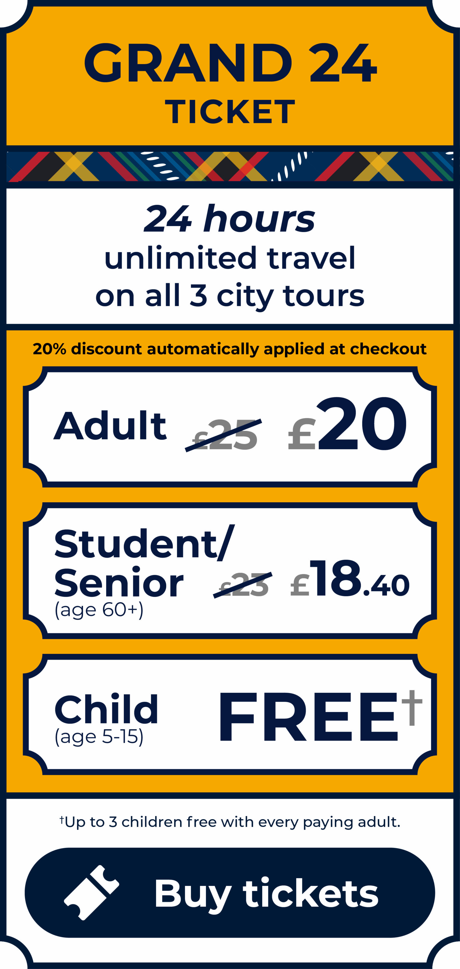 Up to 3 kids go free with a paying adult on all city tours. Taking more than one tour? Kids also go free on our multi-tour Grand24 ticket.